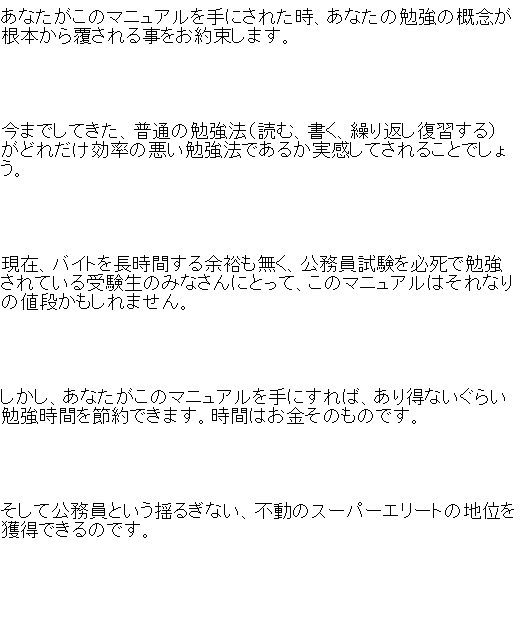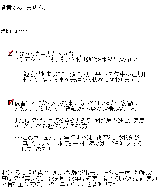 ところが、この「記憶術、速読術」を使う事で、過去問題集(新スーパー過去問ゼミ)を一冊を 覚えるのに3ヶ月掛かってた私が3日で一冊覚えられるようになりました。